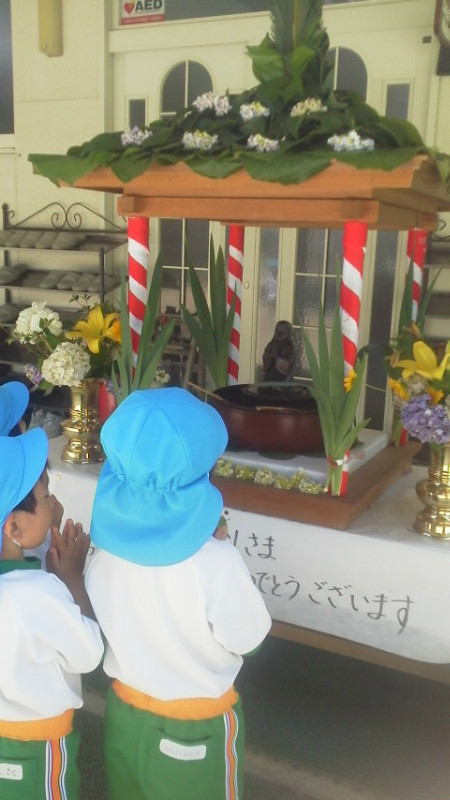 私たちのことをいつも見守ってくださっているお大師様のお誕生日に、みのり幼稚園では御堂を青葉いっぱいに飾り、子どもたちがおうちから持ってきてくれたお花と幼稚園・お寺の周りのお花もお供えし、甘茶をかけ、みんなでお祝いしました。