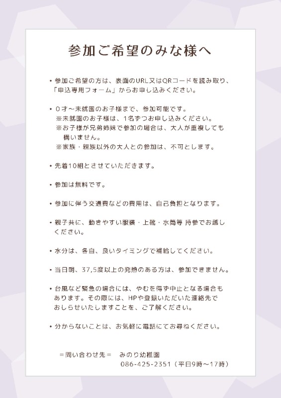 申し込みは、お電話でみのり幼稚園(086-425-2351)まで!